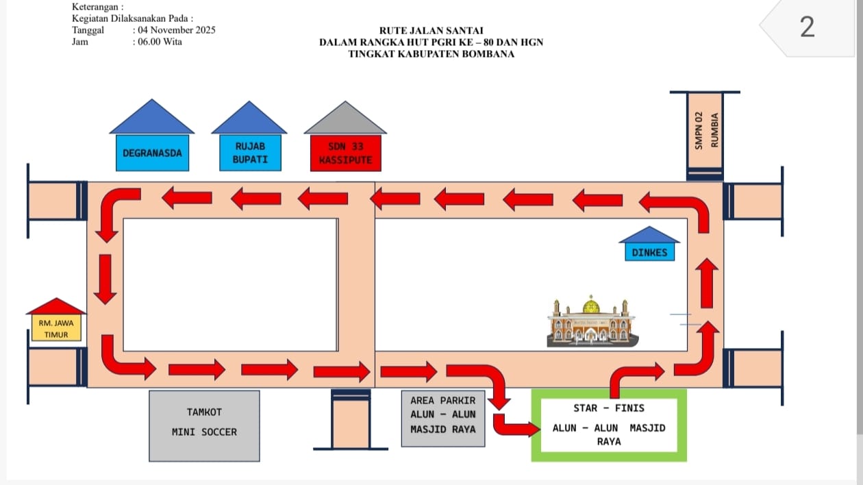 Ketua PGRI Kabupaten Bombana, Kandamang, menjelaskan bahwa kegiatan jalan sehat akan dilaksanakan pada Selasa pagi, 4 November 2025. Ribuan guru akan mengambil start dari Alun-Alun Masjid Raya Kasipute Bombana dan menempuh rute yang telah ditetapkan panitia.