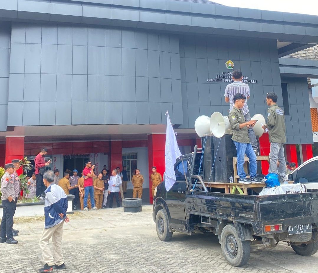 BOMBANANEWS.COM — Himpunan Pemuda Pelajar Mahasiswa Kabaena (HIPPELWANA) menggelar aksi unjuk rasa di Kantor DPRD Provinsi Sulawesi Tenggara, Senin (20/4). Dalam aksi tersebut, HIPPELWANA menyampaikan sejumlah tuntutan terkait dugaan aktivitas pertambangan PT Almharig yang dinilai tidak ramah lingkungan.