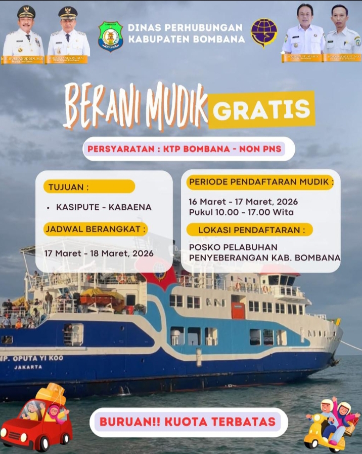 BOMBANANEWS.COM – Pemerintah Kabupaten Bombana melaksanakan program Mudik Gratis bagi masyarakat menjelang Hari Raya Idulfitri 2026.