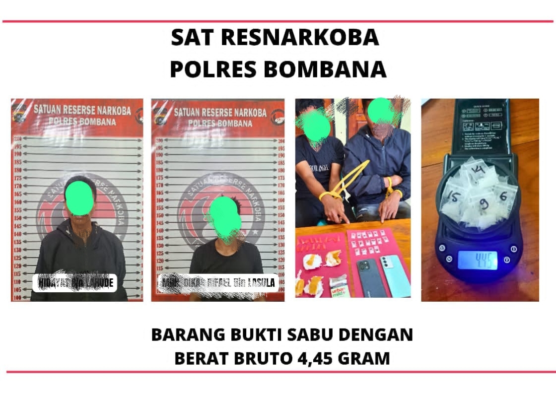 Secara keseluruhan, Satresnarkoba Polres Bombana mengamankan 16 sachet plastik bening berisi kristal yang diduga narkotika jenis sabu dengan berat bruto 4,45 gram, beserta barang bukti lain berupa pipet plastik, tisu yang terbungkus lakban, pembungkus rokok, serta dua unit handphone.