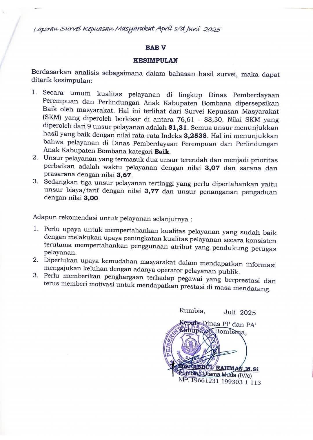 Kepala Dinas P3A Kabupaten Bombana, Abdul Rahman, M.Si, menyampaikan bahwa hasil survei ini menjadi bukti komitmen pihaknya dalam memberikan pelayanan yang responsif, ramah, dan berorientasi pada kepuasan masyarakat. Ia menambahkan bahwa capaian tersebut merupakan hasil kerja sama seluruh pegawai yang terus berupaya menjaga standar pelayanan publik.
